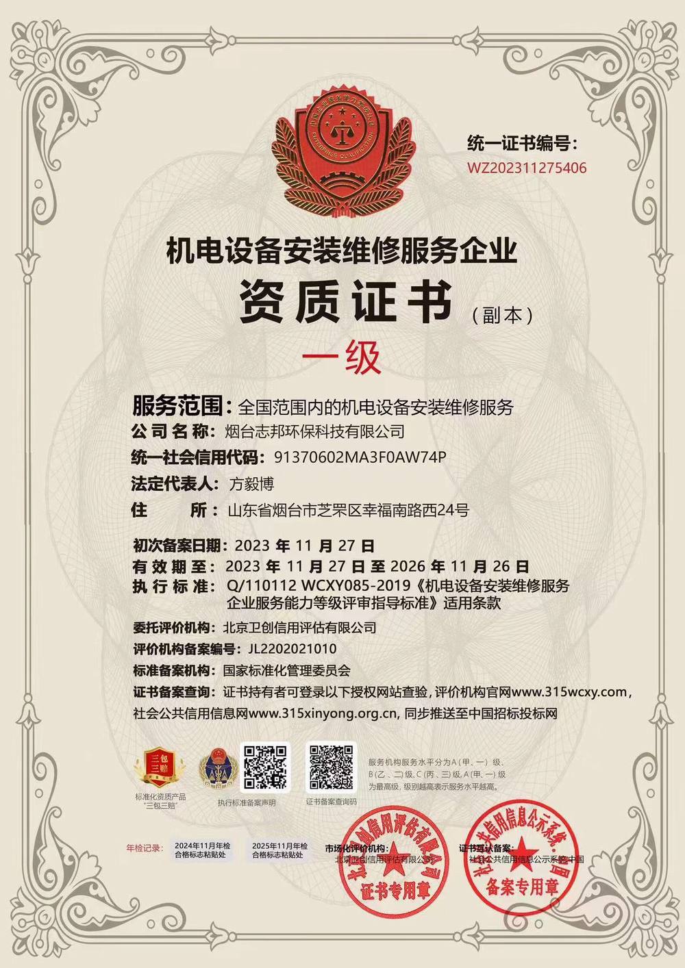 機電設備安裝維修服務企業資質證書 一級